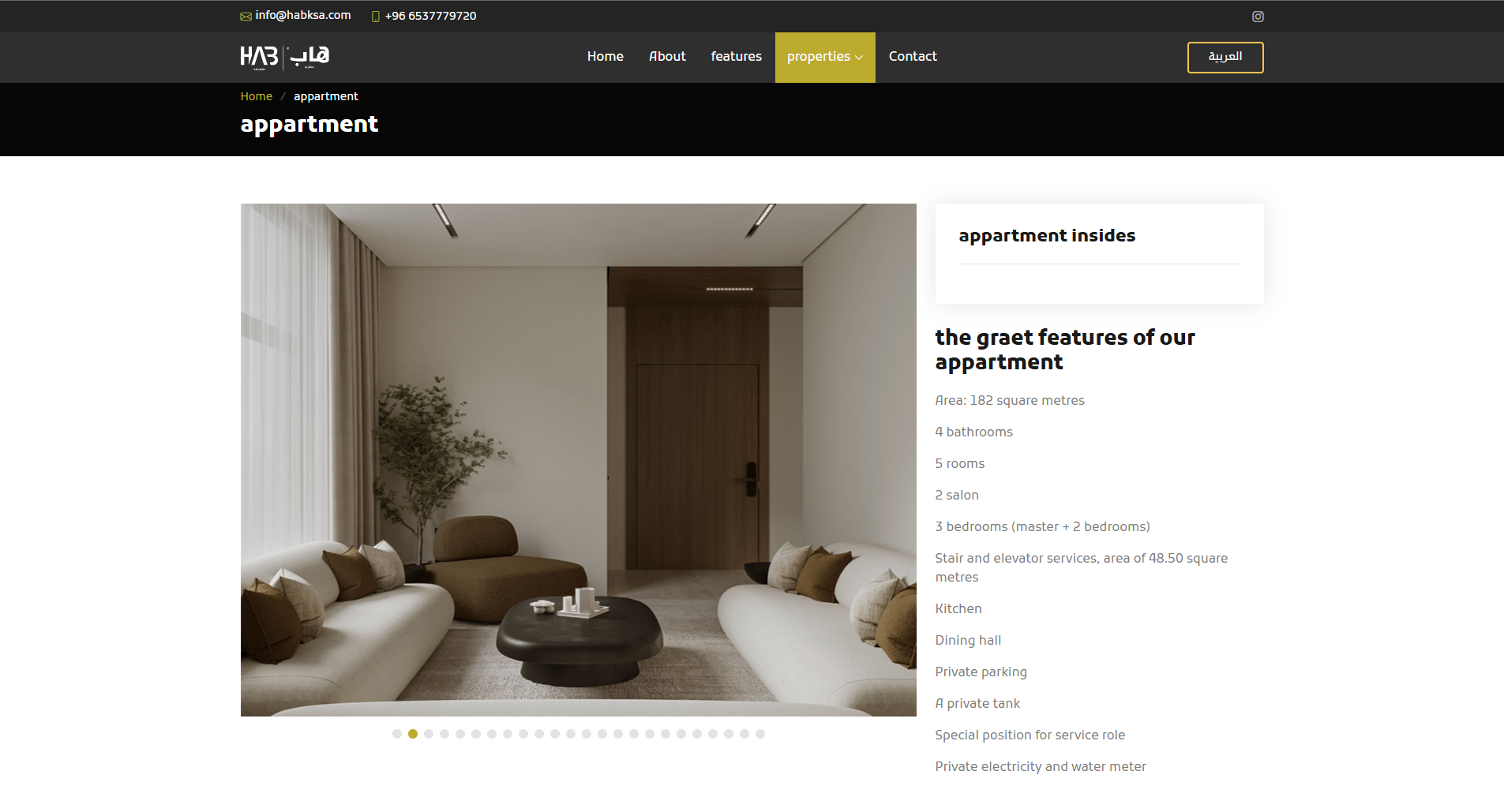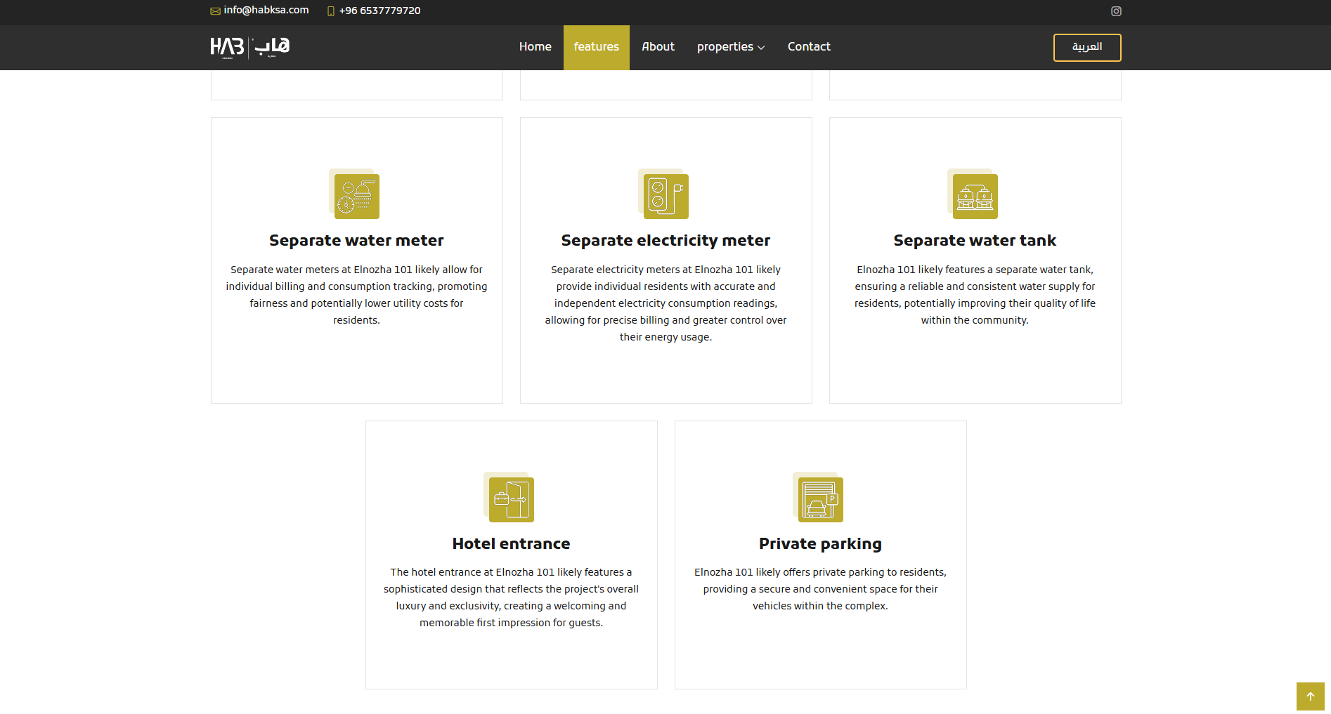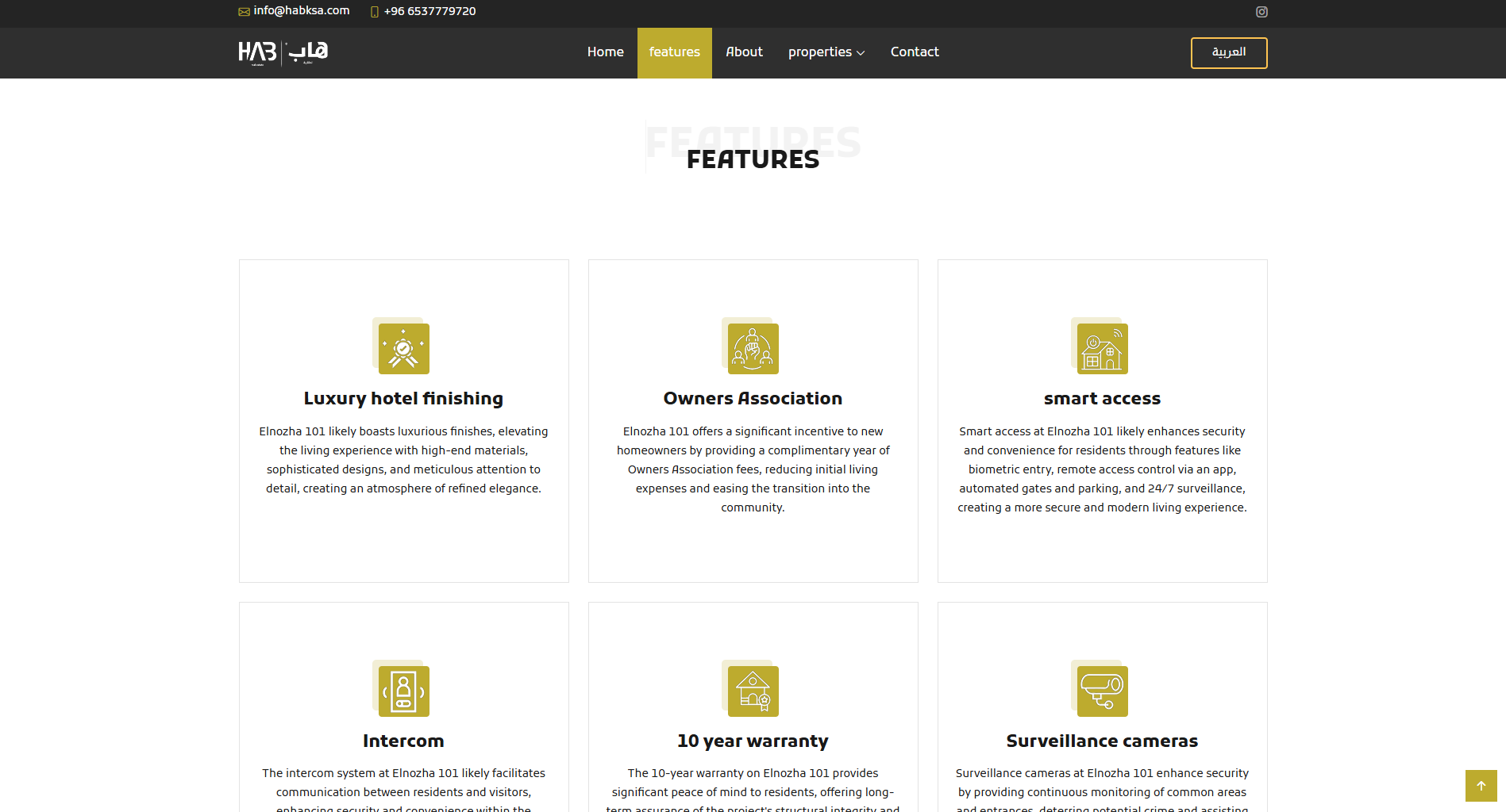 A clean, modern website for a construction company showcasing flagship projects, core services, and company credentials. The page includes a visual slider, project highlights, and clear calls to contact the team. A language toggle enables browsing in English and Arabic.